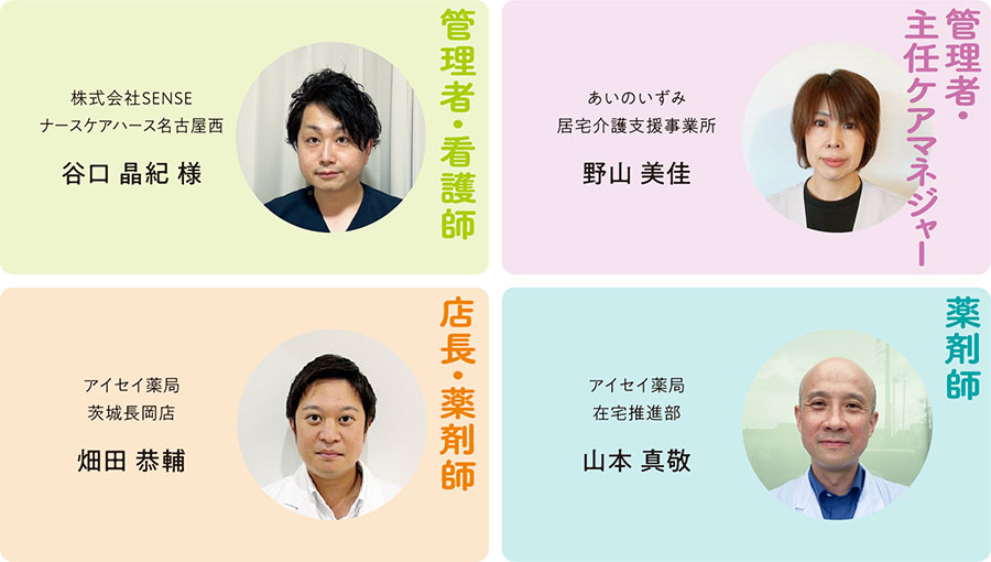在宅医療の現場では、医師・看護師・ケアマネジャー・薬剤師など多職種が連携し、専門性を活かして患者さま・ご利用者さま一人ひとりを支えています。より安心で質の高い医療を実現するために、今回は訪問看護師、ケアマネジャー、薬剤師による座談会を行いました。